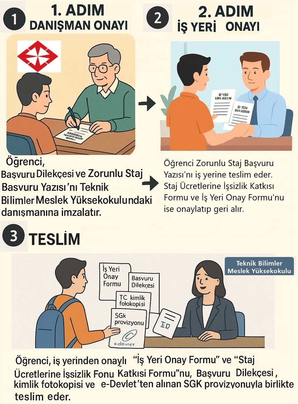 1- Öğrenci Zorunlu Staj Başvuru Yazısı'nı ve Başvuru Dilekçesi'ni Teknik Bilimler Meslek Yüksekokulu'nda danışmanına onaylatır.